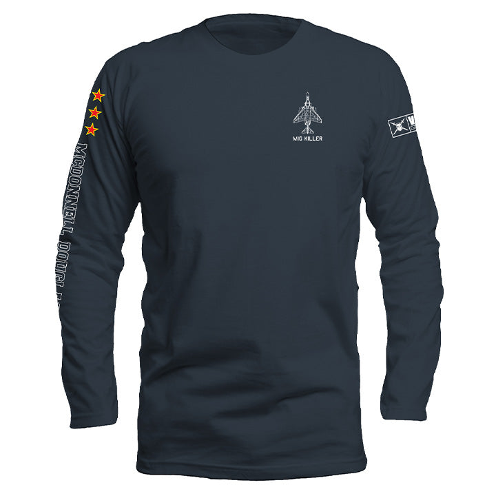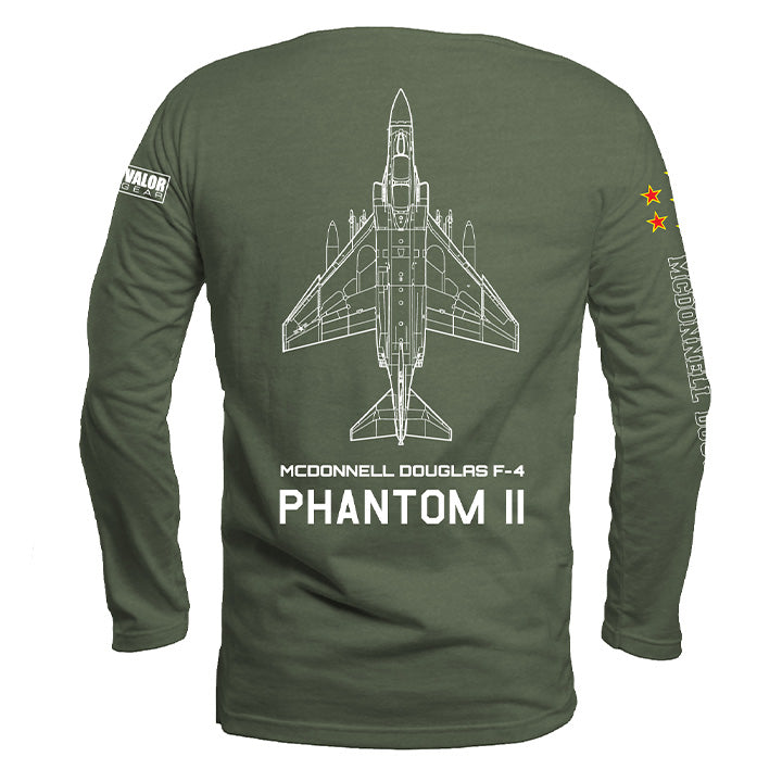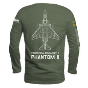 The F-4 Phantom II Long Sleeve T-shirt embodies the F-4 Phantom II and is probably one of the most well known and famous jets ever to be produced. Its use in the Vietnam war and other conflicts around the world made it the jet to beat in most of the 20th century.