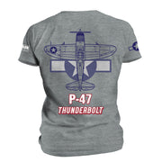 Gray shirt has a blueprint of the P – 47 in navy blue, the original version has a blueprint of the P 47 in white.