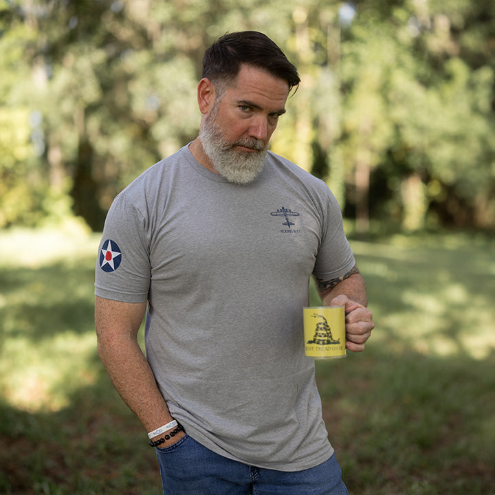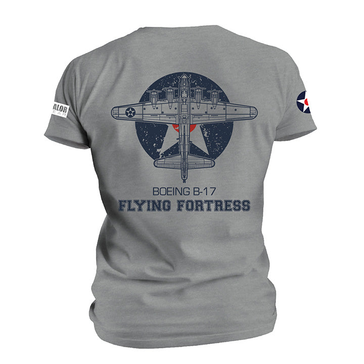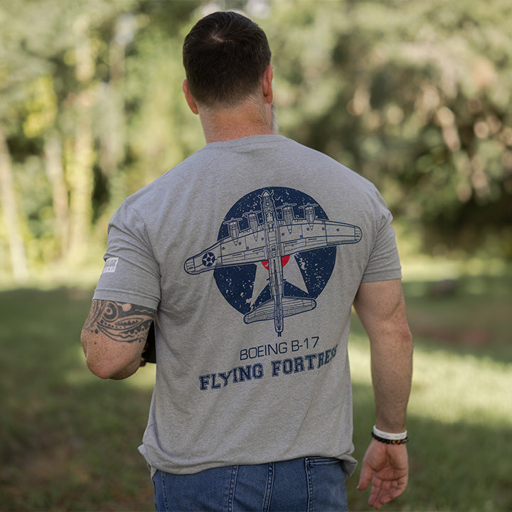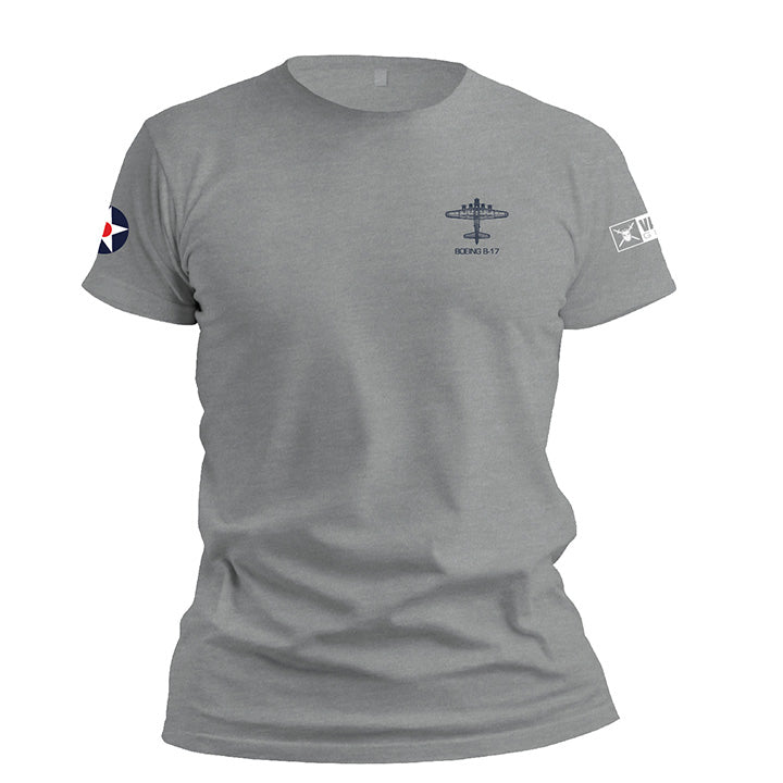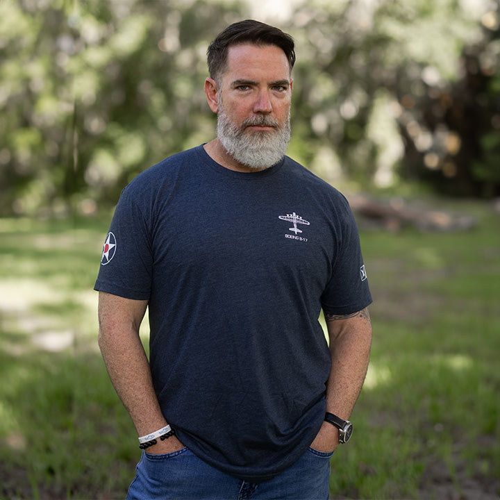 The B-17 Flying Fortress T-shirt embodies the aircraft that entered into WW2 as a premier bomber with longer range and a bigger payload than any other aircraft at the time. Crewed with 10 men, it boasted an impressive defensive armament array of .50 cal machine guns located all over the aircraft. The B-17 Flying Fortress was responsible for the most daylight air-raids over Germany during the war and remains an icon of reliability, firepower and unique design among bombers.