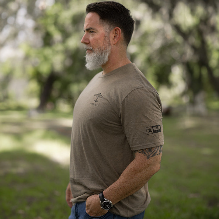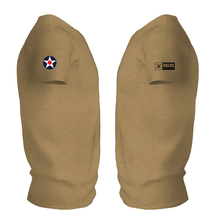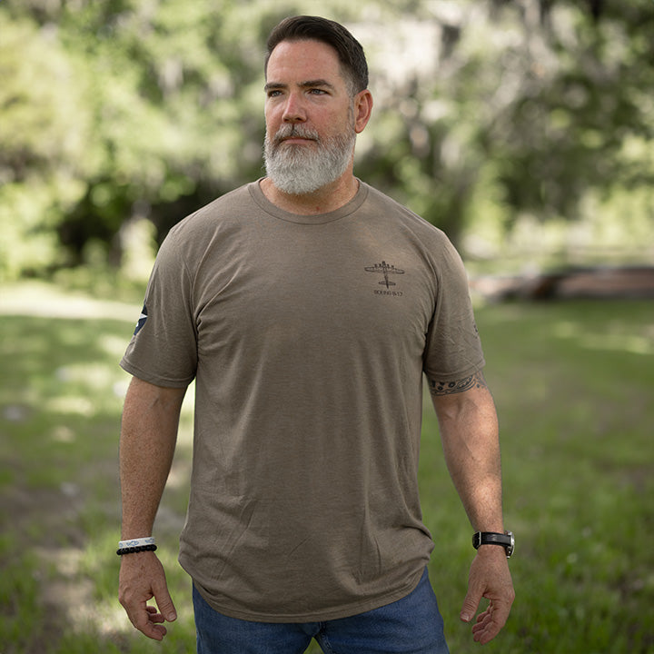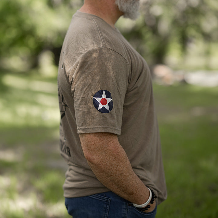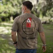 Unique to this shirt is the tail section of the aircraft where the tail gunner sat astride two .50 cal machine guns to protect the rear of the airplane. Eugene Paul Moran was just such a gunner and when his entire tail section of the plane was shot off with him inside, he survived a 4 mile fall to the ground. This shirt honors his memory.