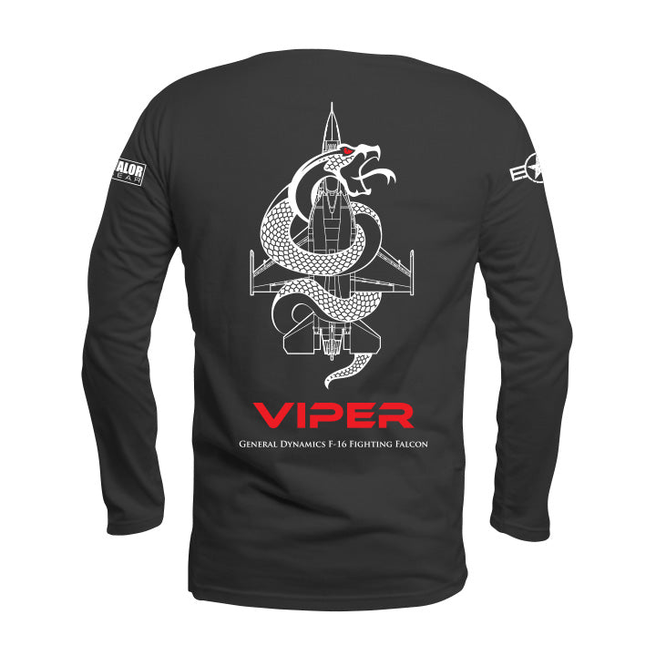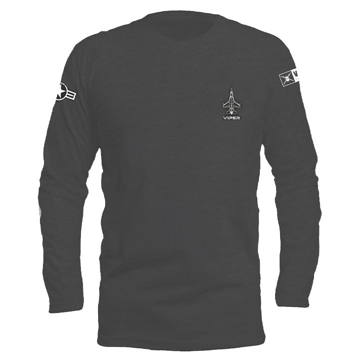 The F-16 long sleeve shirt embodies the General Dynamics F-16 Fighting Falcon, which filled the gap between an air superiority fighter and a ground attack platform like the F-18 Hornet. It is primarily flown by the U.S. Air Force and remains the jet for the Thunderbirds air team. Able to carry a multitude of weapons, it has been used in every theatre of operations that called for a light, fast, attack plane.