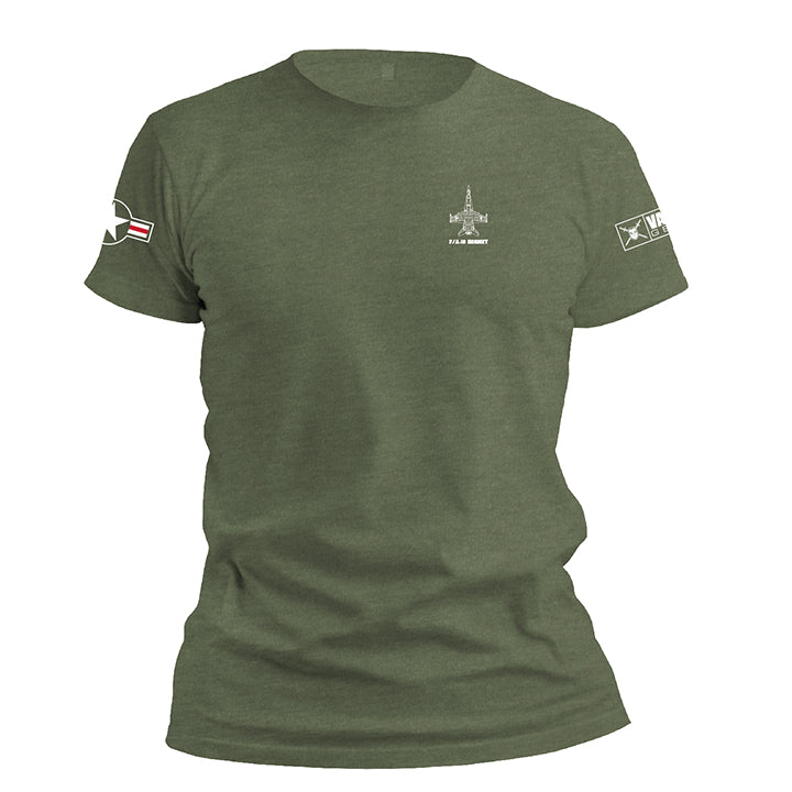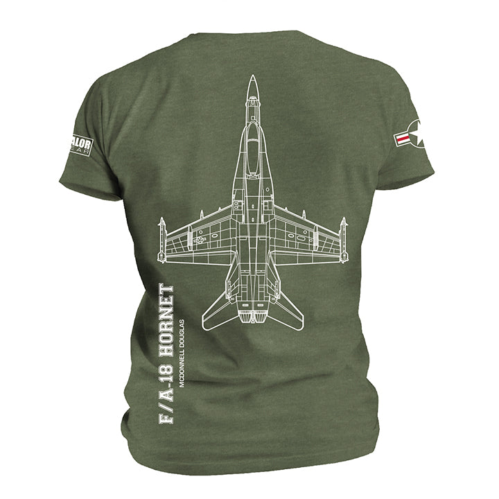 This F/A 18 Hornet McDonnell Douglas t-shirt is a shout-out to the Legacy Hornet fans in the Marines and Navy who flew it into the late 1990s. Built to compete with the General Dynamics F-16 as a lightweight fighter, it was eventually modified to land on carriers and became the backbone of the U.S. Navy carrier force. Originally built in the 1970s, later replaced by the Super Hornet in the early 2000s.