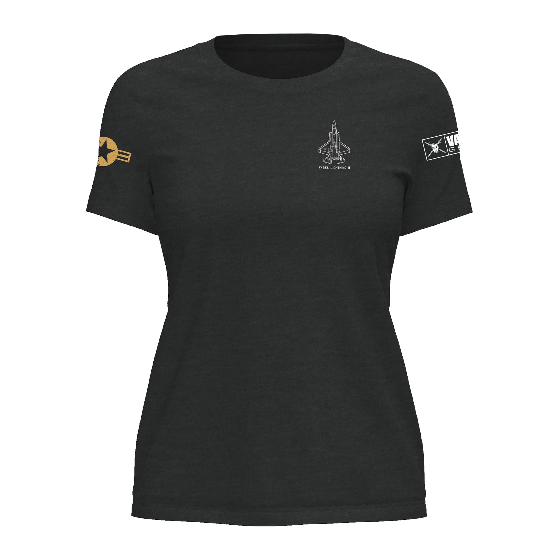 The F-35 T-shirt represents the F-35A Lightning II.  The new Joint Strike Fighter produced by Lockheed Martin, the F-35, comes in three variations due to the different requirements of the US Air Force, Navy, and Marines.