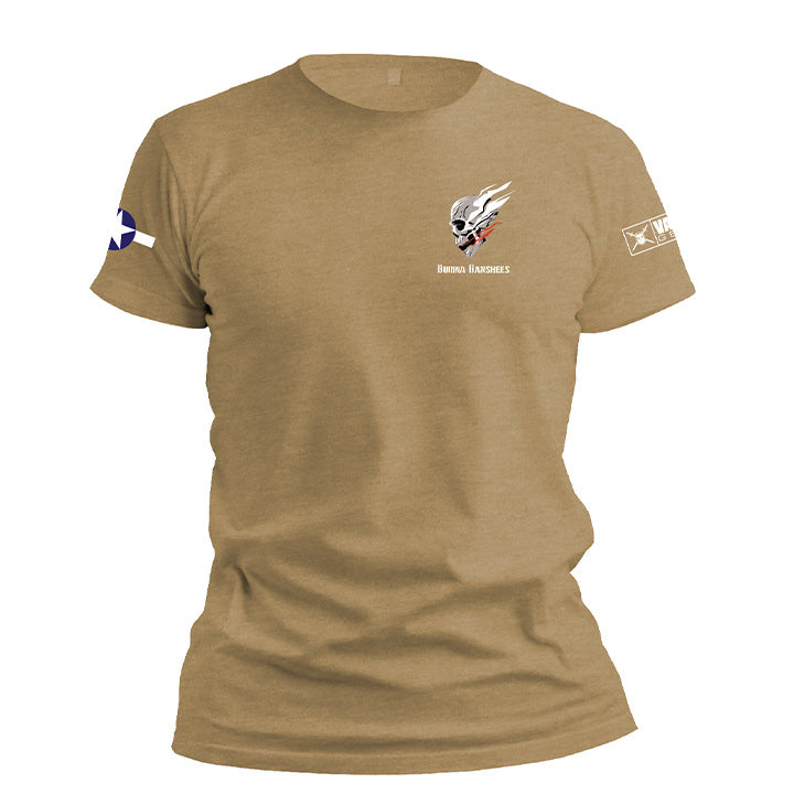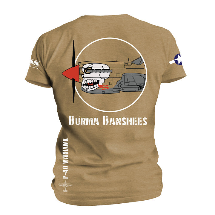 The P-40 Burma Banshees T-shirt embodies the Curtiss P-40 Warhawk aircraft which was outdated, outgunned, and slower than its contemporaries by the time WW2 started, but it became one of the most well-known fighter aircraft of all time.