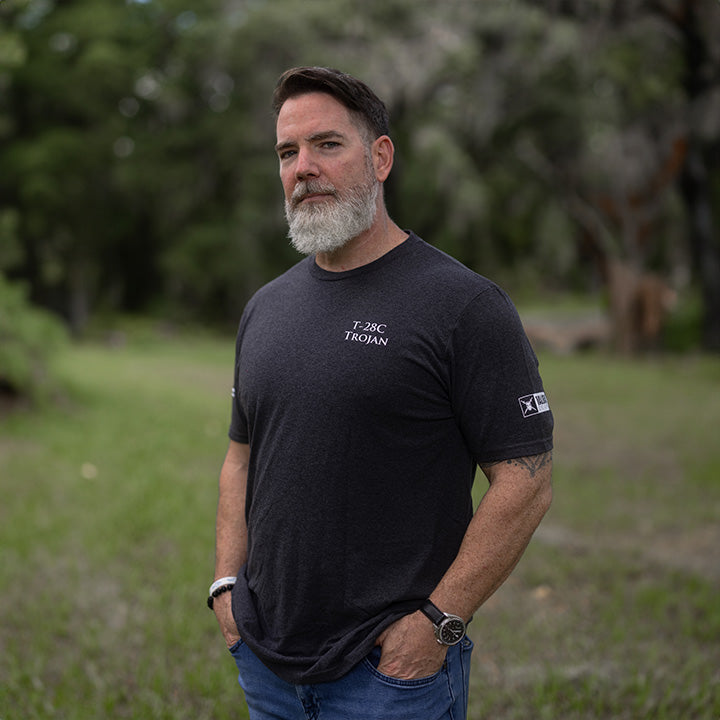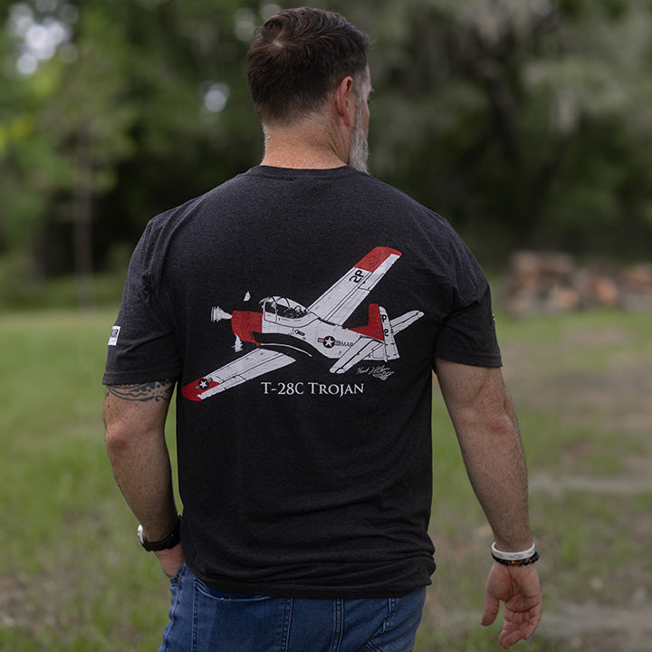 This T-28C Trojan t-shirt is to honor the brave pilots who flew this aircraft, primarily as a trainer but also in combat. Manufactured by North American Aviation in 1950, the Trojan was also used in combat operations in Vietnam and by several other countries as a close air support aircraft. The CIA used the Trojan in Africa operations in the 1960s. Twenty-three Trojans were lost to combat operations in Vietnam.