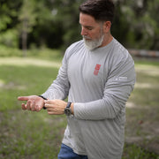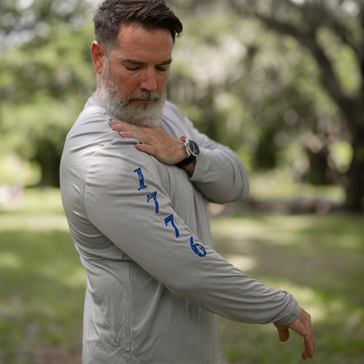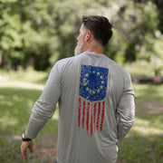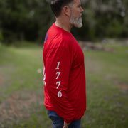The 1776 Betsy Ross Flag Long Sleeve Dry Fit Shirt represents a piece of American history that cannot be forgotten as one of the first flag designs of the United States. While debate continues as to whether Betsy Ross actually contributed to the design, it is not argued that she did in fact produce the flag as she was an upholsterer of some note.