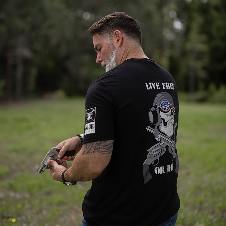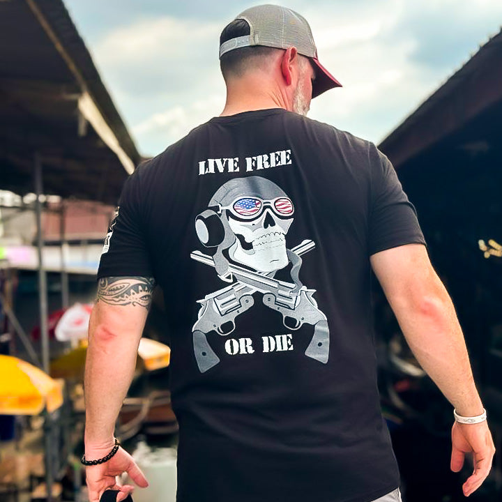 This Live Free or Die T-shirt represents the famous words of General John Stark, the American Revolution soldier who represented New Hampshire, and the skull and guns of a Navy squadron in Pensacola Florida, the VT-6 Shooters