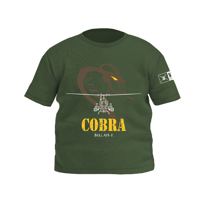 The Bell AH-1 Cobra Kids T-shirt embodies what was the first of a series of attack helicopters used extensively in the Vietnam Conflict up until 2001 by the U.S. Army.  It was armed with rockets, grenades and machine guns to deadly effect.  Several variants of this attack helicopter were made and used by various countries around the world.