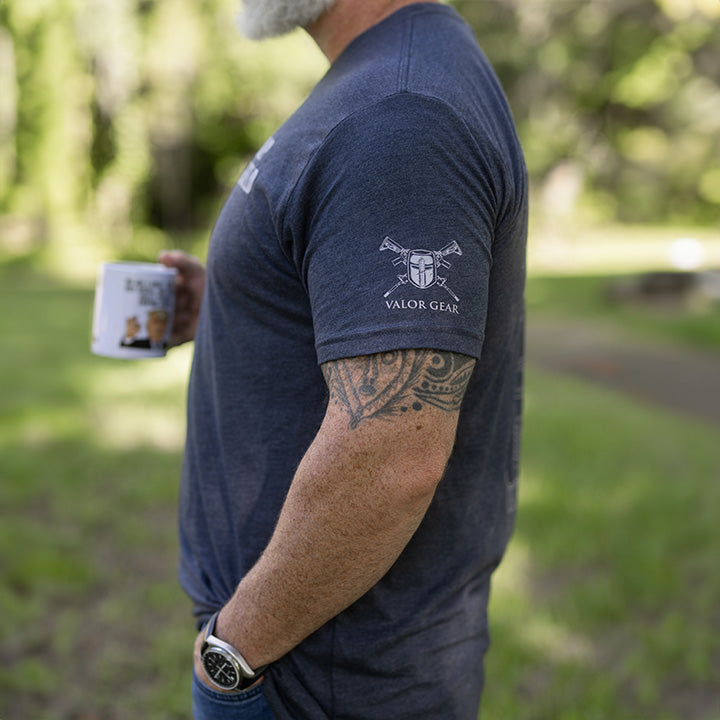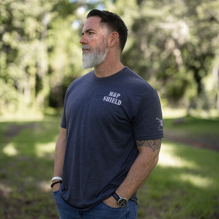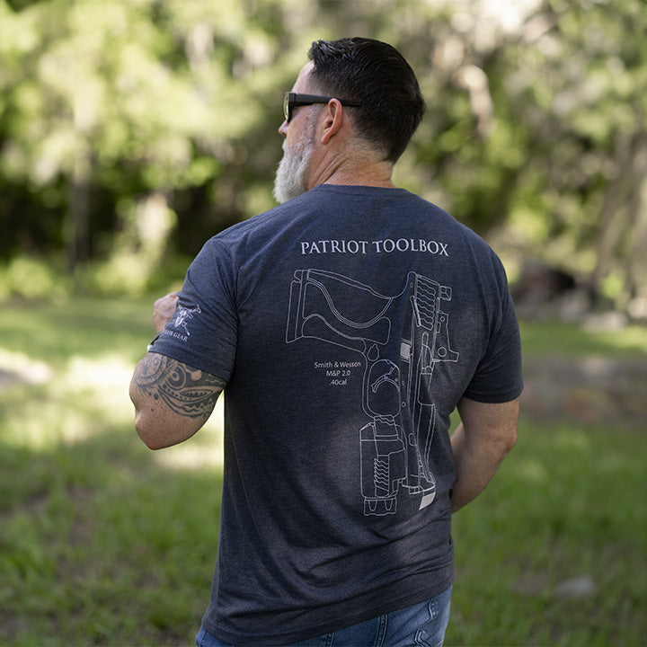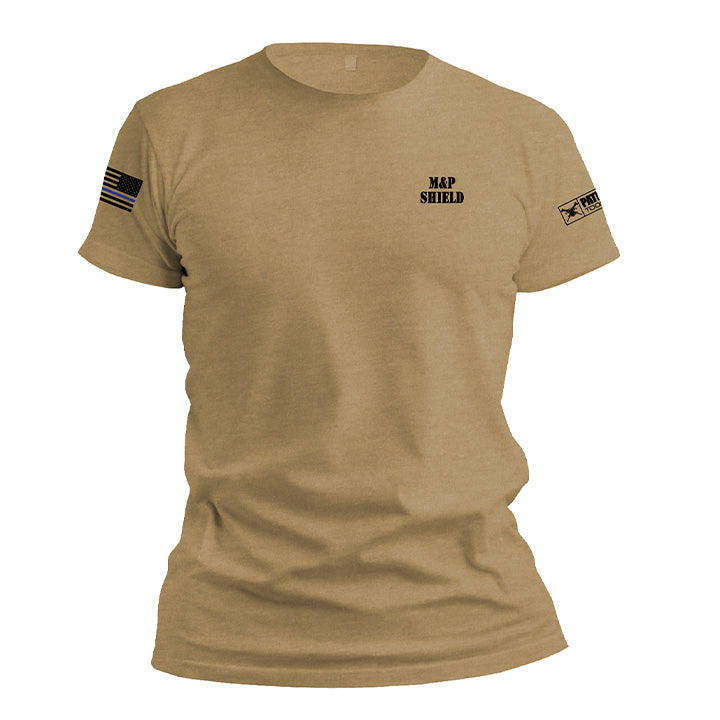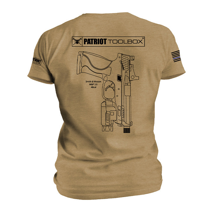 This Smith and Wesson M&P 2.0. T-shirt showcases a semi-automatic handgun used by the military and police but is available to the civilian market as well. It comes in a variety of calibers from .22LR to 10mm.